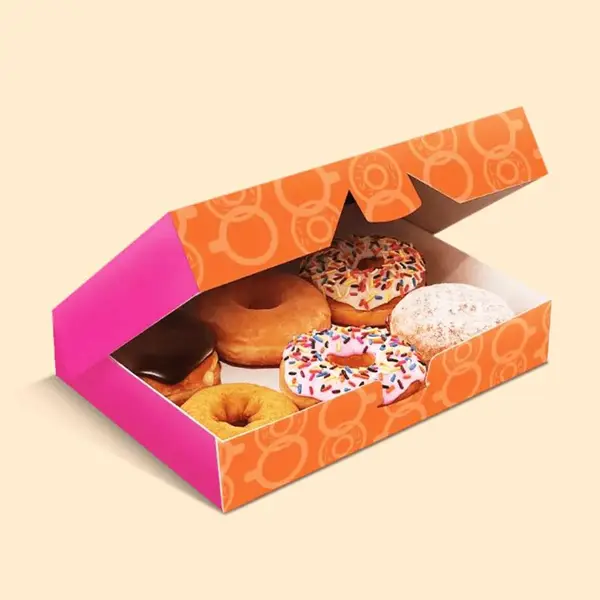 Our Branded Donut Boxes packaging is thoughtfully designed to keep your donuts fresh, secure and irresistibly presentable and also we use durable, food safe materials that prevent grease stains and maintain the boxes structure during transport. Each box can be fully customized with your brand colors, logo and design helping your bakery standout on shelves and in customers hands. Whether you are packaging a single donut or a dozen, our boxes also come in optional features like windows, locking lids and eco friendly finishes. We prioritize both functionality and visual appeal. Other benefits of choosing us are